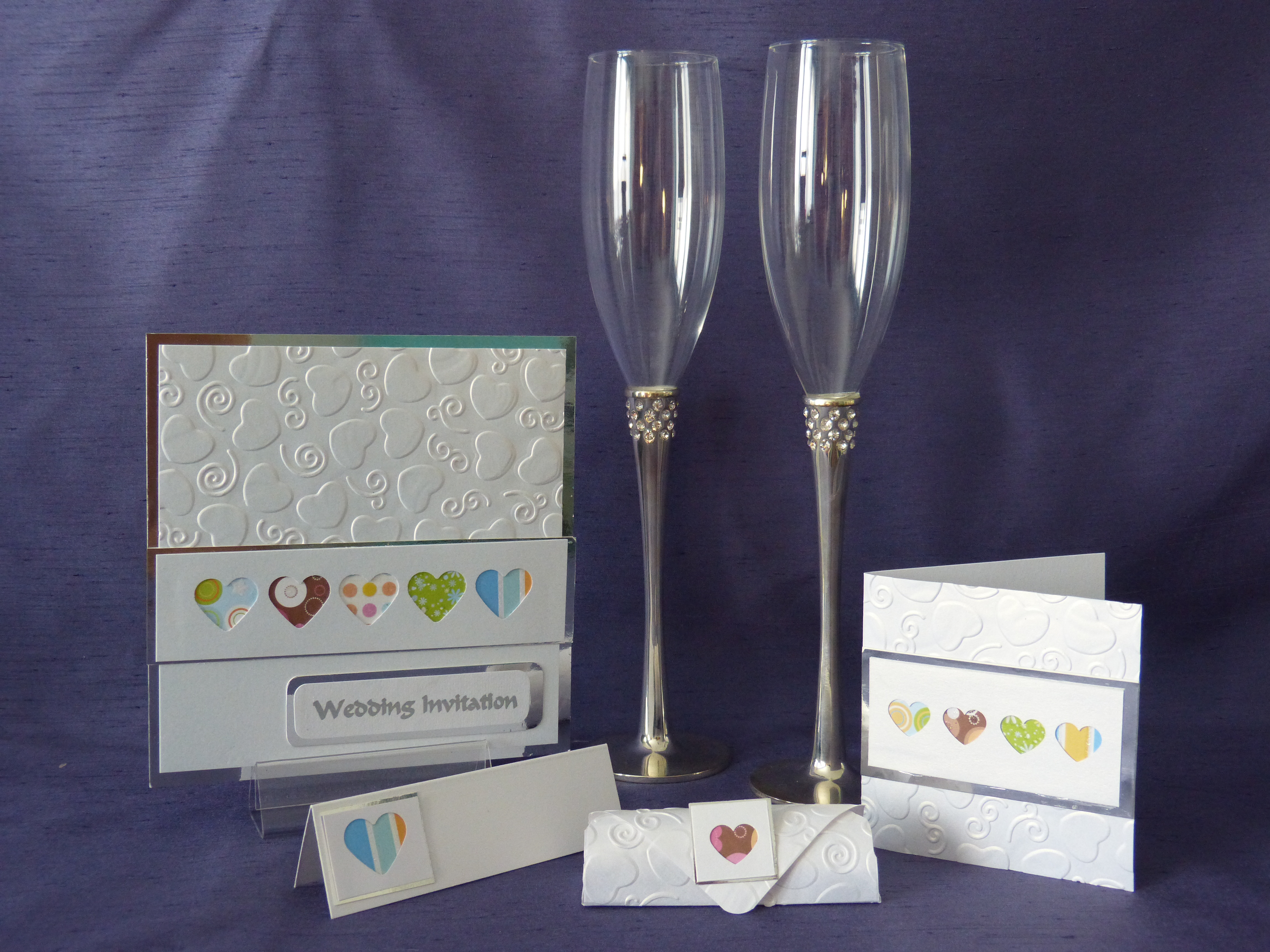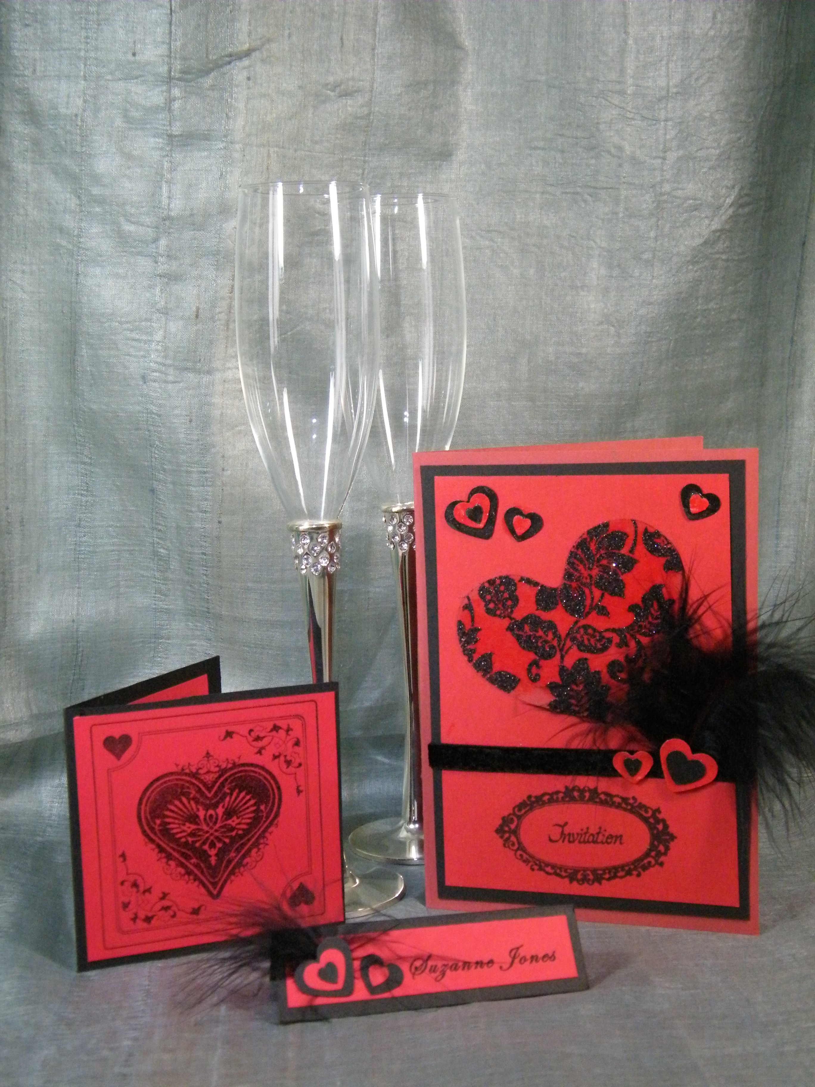 Todays card collection is definitely for those who want something different. With the red background and black velvet and feather embellishment, it definitely has a burlesque feel. The heart theme running throughout though makes it perfect for those who want to make a bold statement with their wedding invitations